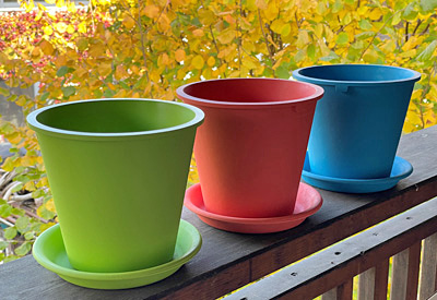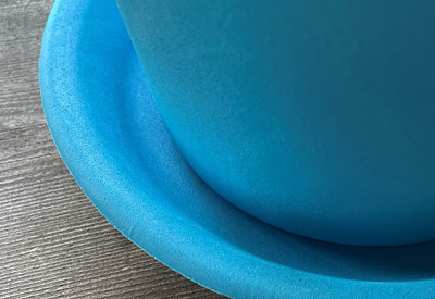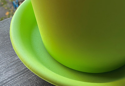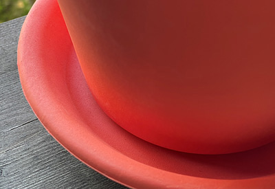 Jeweils ein Topf mit gleichfarbigem Untersetzer.